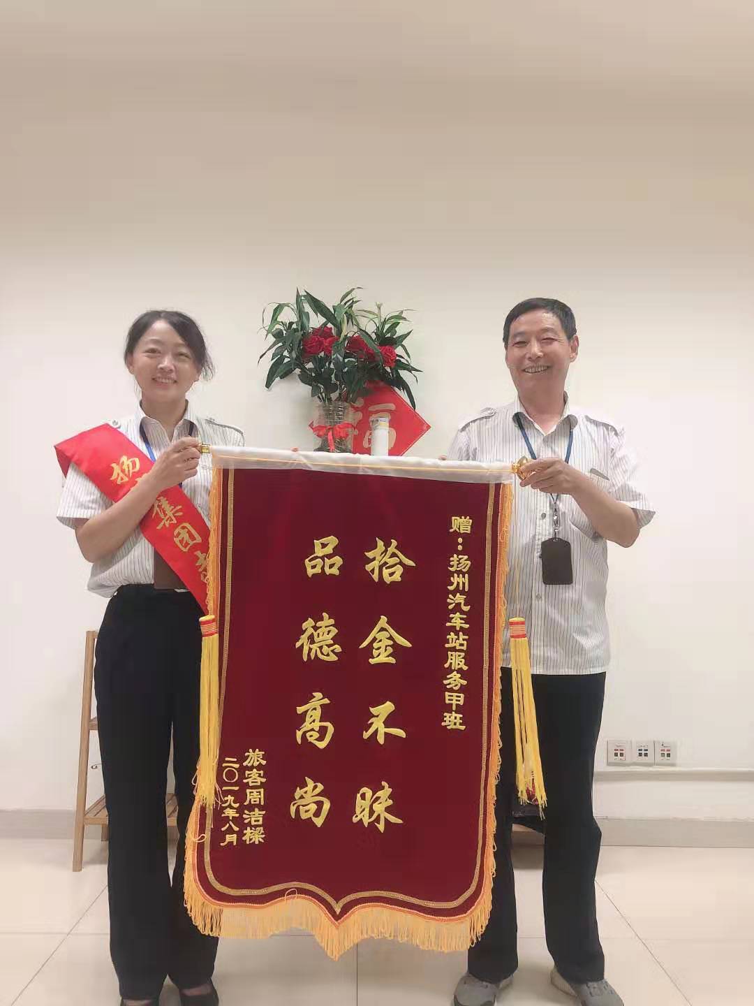 8月2號,杭州的周女士和同伴乘坐大巴車來揚州游玩。不慎將裝有蘋果手機和錢包的手提袋遺忘在廁所的掛鉤上。后在揚州汽車站服務(wù)班工作人員的幫助下,尋找到了失物。8月6日,已經(jīng)回到杭州的周女士特地郵寄來了錦旗,感謝揚州汽車站服務(wù)班組工作人員。