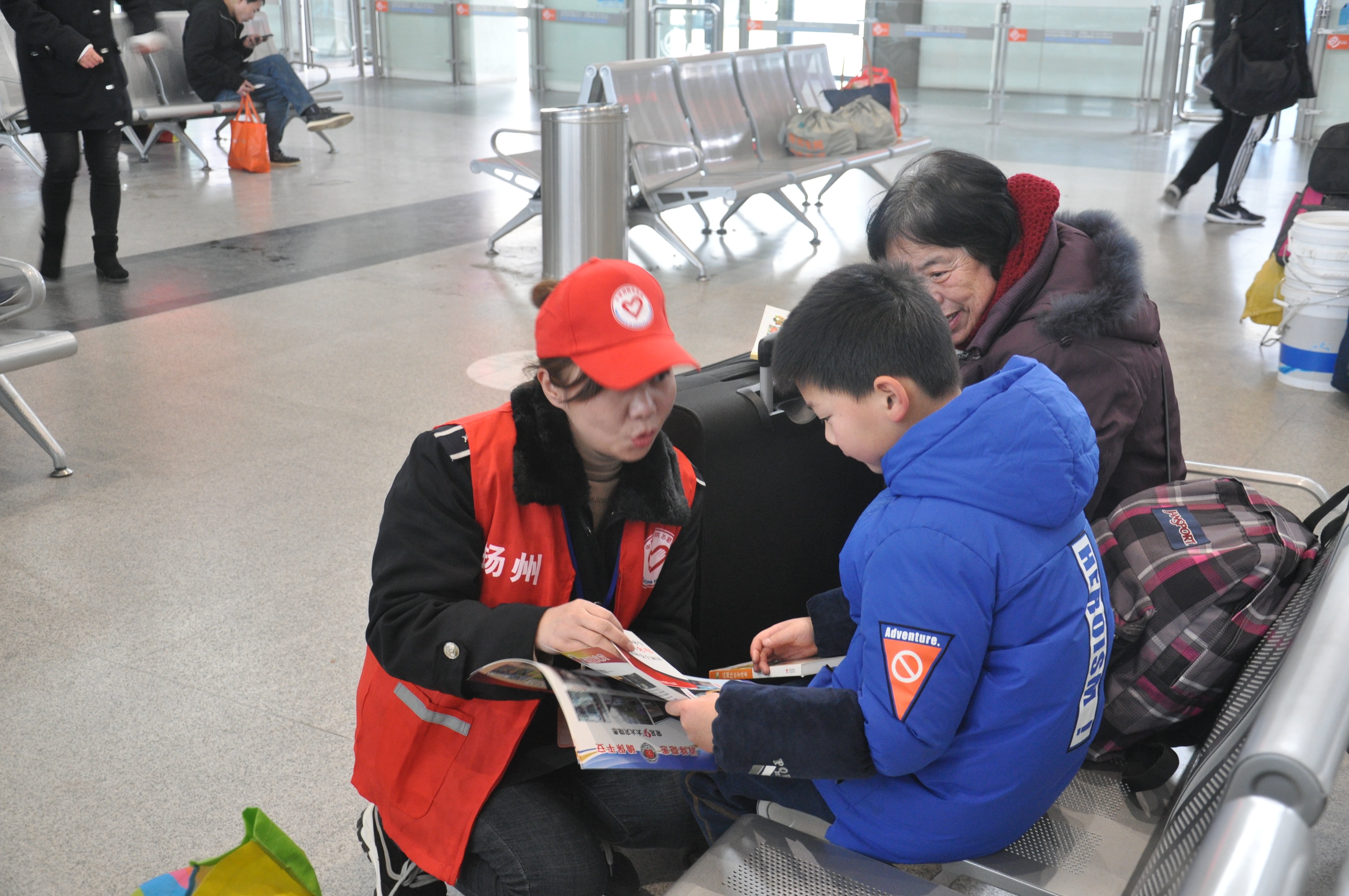 活動現(xiàn)場提供了種類繁多的書籍和春聯(lián),旅客們在宣傳臺前駐足,為孩子、親人或自己精心挑選,氣氛熱烈;顒蝇F(xiàn)場還安排了揚汽集團志愿者向來往旅客進行消防安全知識的宣傳和講解。