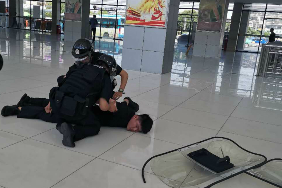 本次演練主要針對(duì)人員密集場(chǎng)所犯罪分子持刀砍殺旅客的警情進(jìn)行模擬。一名“黑衣男子”因生活受挫報(bào)復(fù)社會(huì),在江都客運(yùn)站售票大廳內(nèi)持刀砍殺旅客。車(chē)站工作人員立即疏散旅客,利用110聯(lián)動(dòng)中心緊急聯(lián)系警方。當(dāng)接到報(bào)警后,110指揮中心立即發(fā)出指令,要求江都區(qū)特警大隊(duì)、刑警大隊(duì)、交警大隊(duì)以及新區(qū)派出所人員攜帶裝備迅速趕到客運(yùn)站展開(kāi)抓捕工作。警方將“嫌疑人”有效隔離后,迅速利用盾牌、鋼叉、抓捕器等防護(hù)武器將其制服。