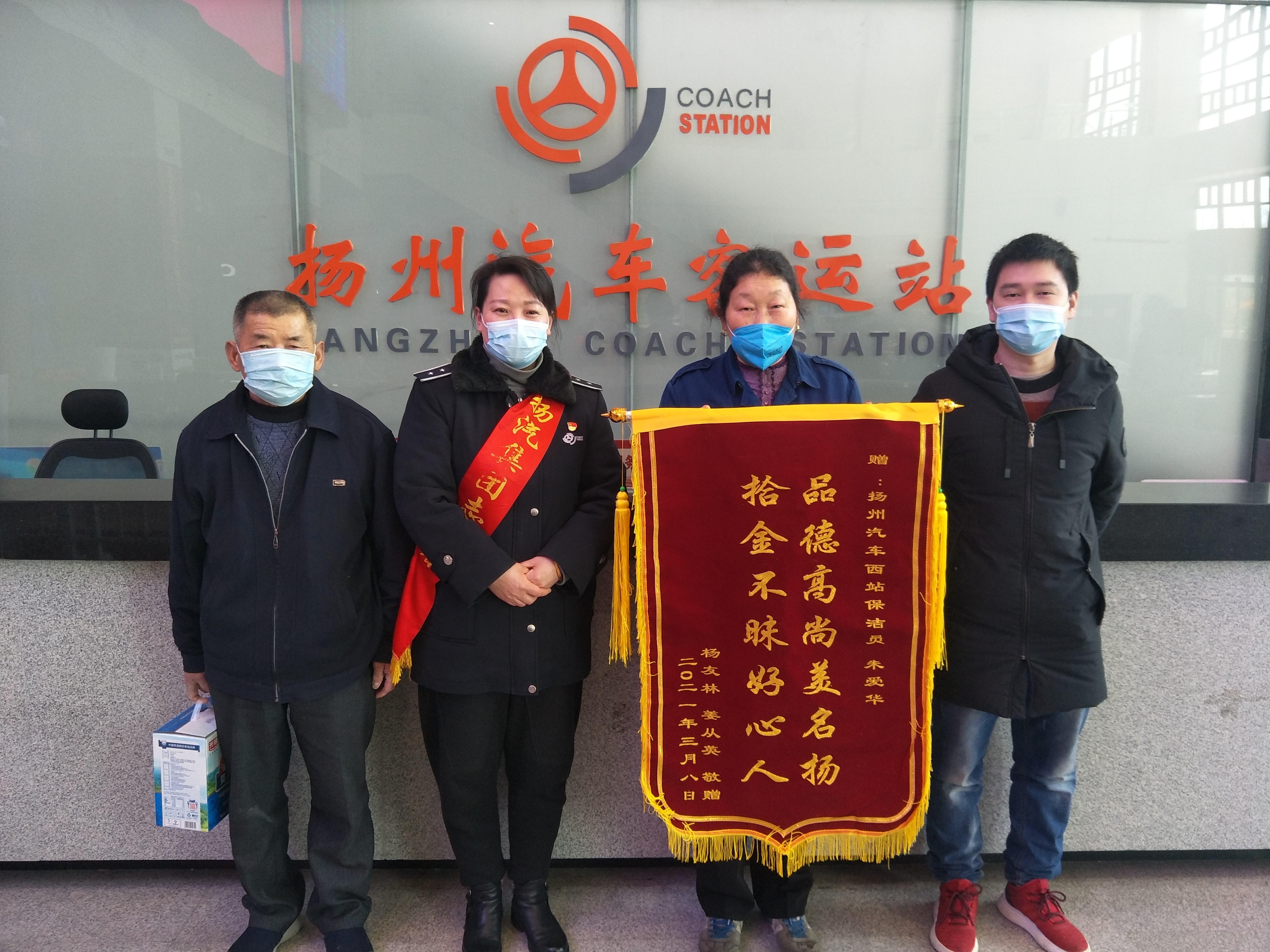 “品德高尚美名揚(yáng),拾金不昧好人心”,3月22日上午,揚(yáng)州汽車站收到一面來(lái)自旅客的錦旗,對(duì)車站保潔員朱愛(ài)華拾金不昧的品德和工作人員熱情周到的服務(wù)表示了高度贊揚(yáng)和誠(chéng)摯感謝。