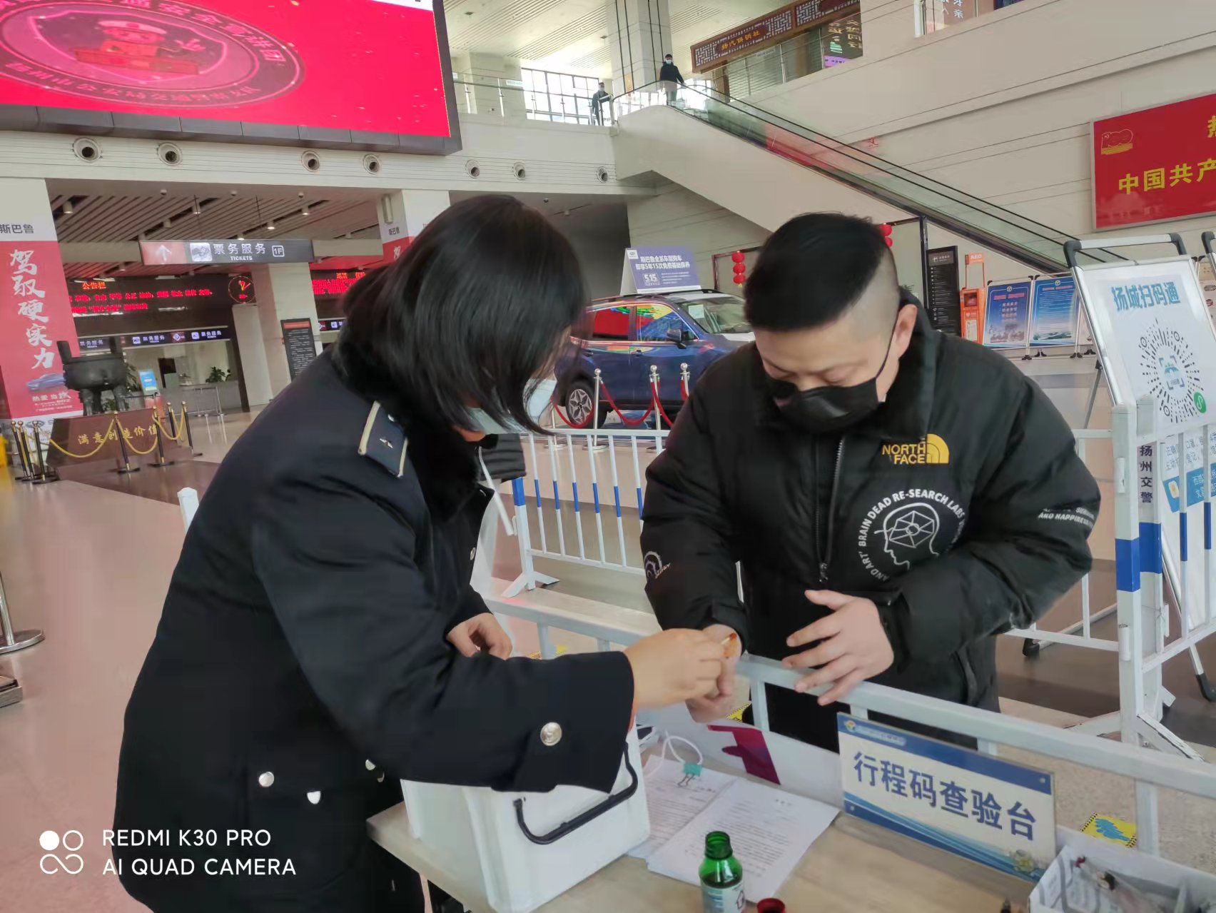 下午一點(diǎn)半,揚(yáng)州汽車站售票大廳門口,正在認(rèn)真查驗(yàn)行程碼的劉揚(yáng),看著對(duì)面遞身份證過(guò)來(lái)的一雙手,手上傷痕累累,手里握著一團(tuán)紙巾,紙巾上血跡斑斑,于是關(guān)切地詢問(wèn)起來(lái)。經(jīng)詢問(wèn)得知,原來(lái)旅客于先生是常州人,在揚(yáng)州出差三天了,估摸著今天的工作能夠忙完,想早點(diǎn)趕回常州,工作一結(jié)束,便從工作地點(diǎn)騎公共電動(dòng)車來(lái)?yè)P(yáng)州汽車站乘車,誰(shuí)知一個(gè)不小心,摔了一跤,羽絨服破了,手機(jī)摔壞了,兩只手也蹭破了好幾處,血不停地淌。