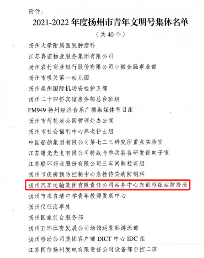 揚(yáng)汽集團(tuán)東部樞紐汽車站防疫班榮獲青年文明號集體榮譽(yù)稱號