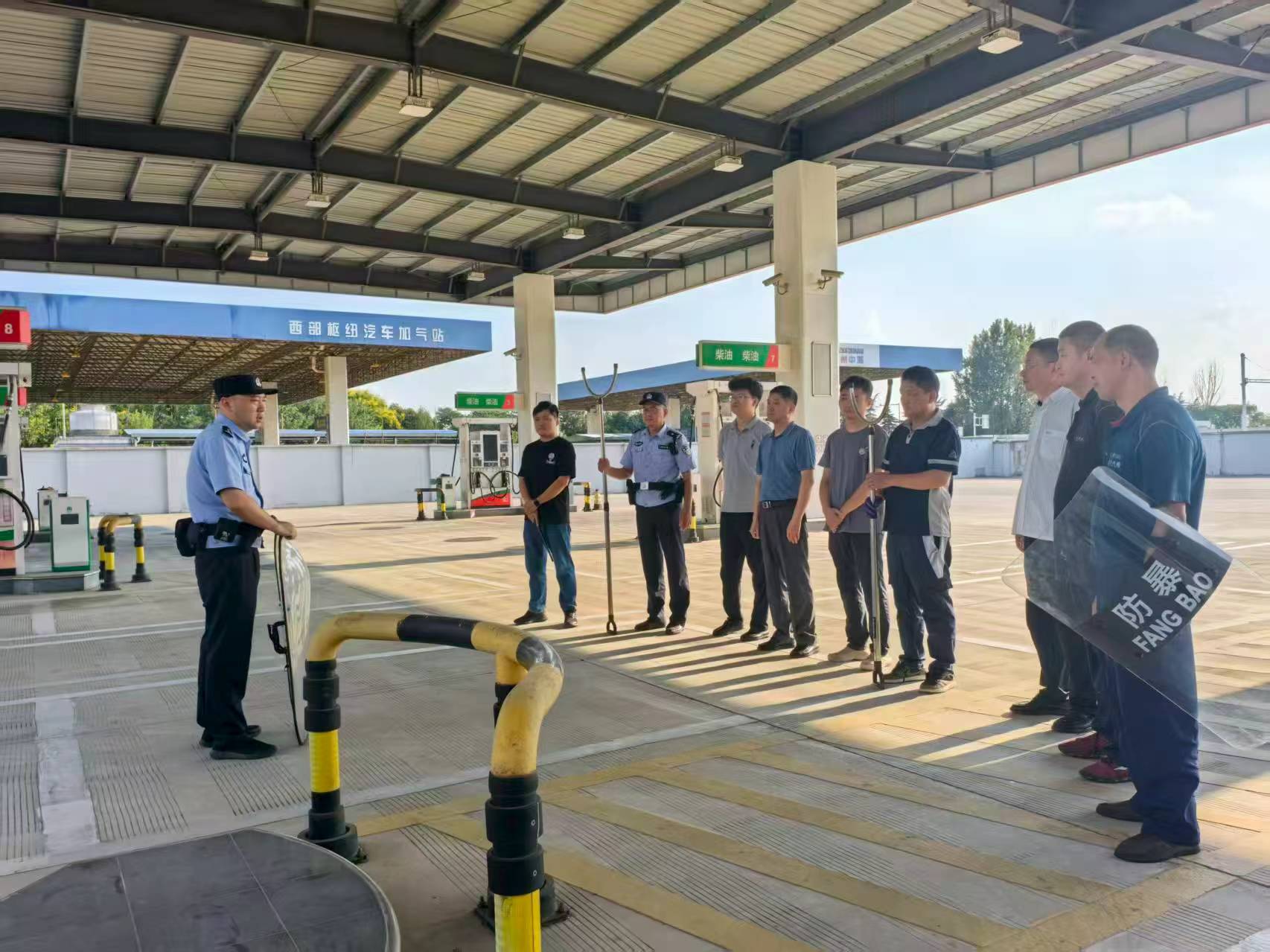 演練前期,雙方周密部署,制定了詳實(shí)的演練方案,明確了崗位職責(zé)與處置流程。車站派出所民警結(jié)合加油站實(shí)際,對(duì)參演人員開展了反恐知識(shí)及防護(hù)技能的系統(tǒng)培訓(xùn)。演練模擬“恐怖分子”強(qiáng)行闖入加油站的突發(fā)場景。現(xiàn)場配備盾牌、防刺背心等專業(yè)裝備,營造出高度緊張的實(shí)戰(zhàn)氛圍,有效檢驗(yàn)了人員的應(yīng)急反應(yīng)與協(xié)同處置能力。